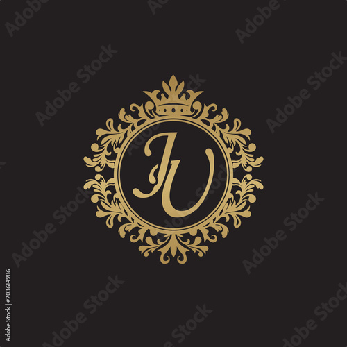 Initial letter JU, overlapping monogram logo, decorative ornament badge, elegant luxury golden color