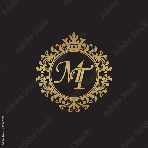 Initial letter MT, overlapping monogram logo, decorative ornament badge, elegant luxury golden color