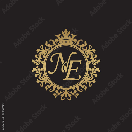 Initial letter NE, overlapping monogram logo, decorative ornament badge, elegant luxury golden color