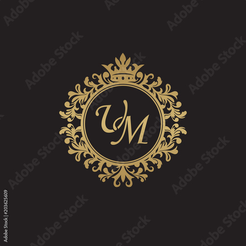 Initial letter UM, overlapping monogram logo, decorative ornament badge, elegant luxury golden color