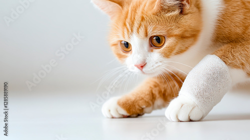 Injured cat with bandaged paw explores indoors, showcasing resilience and adaptability. Discover pet care tips for feline recovery.