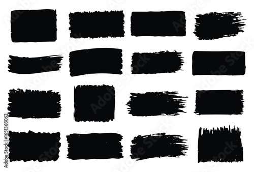 Ink stencil brush strokes and grunge lines with paint splashes drawn in a rectangular shaped composition for text, callouts. Brush strokes in dirty style with drops blots. Grunge banners. Vector set