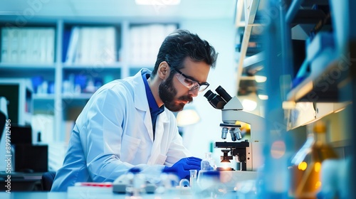 Innovation and precision of an engineer working in a high-tech lab, captured with a portrait lens during a bright afternoon. This clean and high-contrast image emphasizes scientific work