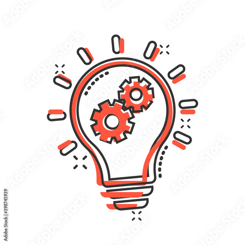 Innovation icon in comic style. Lightbulb with cogwheel cartoon vector illustration on white isolated background. Idea splash effect business concept.