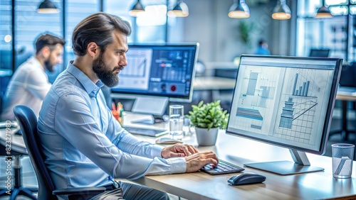 Innovation Manager with Prototype Design: An innovation manager working on a digital prototype design, showcasing product development technology.