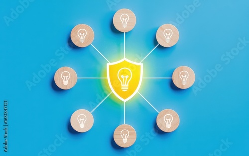 Innovation Protection Safeguarding Bright Ideas with a Shield and Connected Lightbulbs on Blue Background