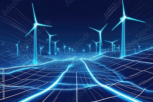 Innovative Abstract Vector Artwork Showcasing Renewable Energy Technology with Luminous Lines and Dynamic Motion Against a Deep Blue Backdrop