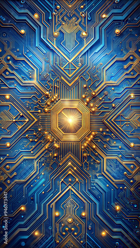 Innovative circuit board pattern with golden elements and central core on a blue background