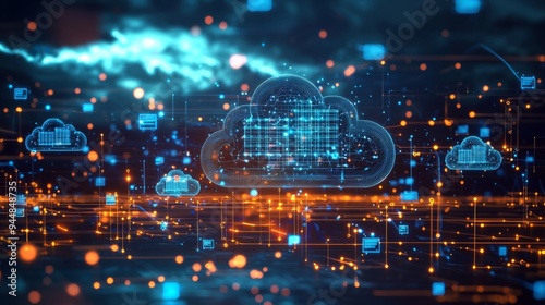 Innovative cloud infrastructure architecture, with interconnected data centers floating in a digital sky, representing secure and scalable solutions