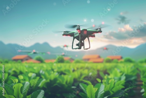 Innovative green isometric unmanned agritech drones for aerial crop monitoring, using efficient agricultural equipment and vehicles