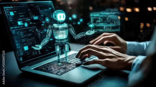 Innovative hands typing on laptop with floating ai robot concept technology hub digital interaction night view