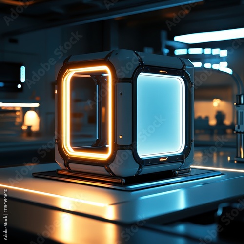 Innovative High-Tech Storage Cube with Illuminated Edges in Futuristic Workspace Digital Art Modern Environment Close-Up