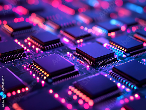 Innovative microchip system with vibrant lights and intricate circuitry, showcasing advanced technology and design