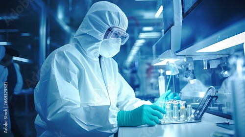 innovative researcher in protective mask creating medicines and vaccines in laboratory - close-up image