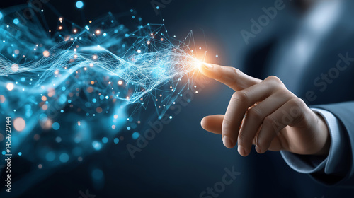 Innovative technology concept showcasing a human hand interacting with digital elements in a dynamic abstract environment