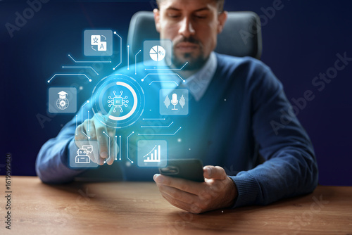 Innovative technology concept with man using smartphone and holographic display in modern office environment