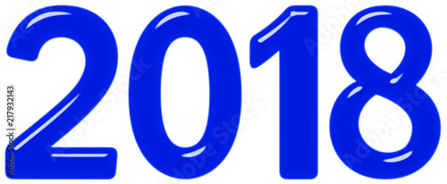 Inscription 2018 from blue glass or plastic, isolated on white background, 3d render