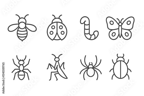 Insect Line Icons. Line style icons of garden insects: bee, ladybug, worm, butterfly. ant, praying mantis, spider, beetle.