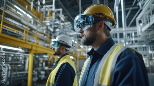 Inside a heavy industrial facility, engineers wearing AR glasses inspect machinery while viewing real-time data overlays