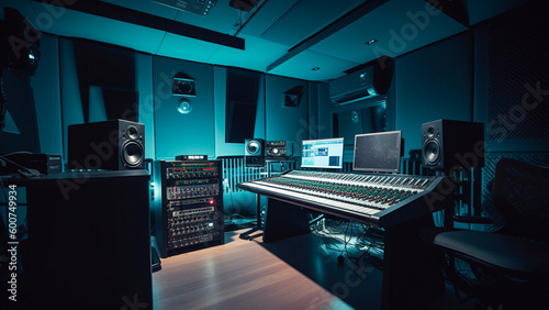 Inside a Modern Sound Recording Studio in Blue Toned. Behind the Music. Perfect for Audio Engineers and Music Lovers.