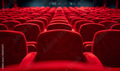 Inside the cinema or the theater: Empty rows of red luxury chairs decorated with mood lighting, await the audience.