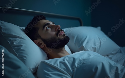 Insomnia concept. Depressed arab man unable to sleep, lying in bed and looking up, copy space. High quality