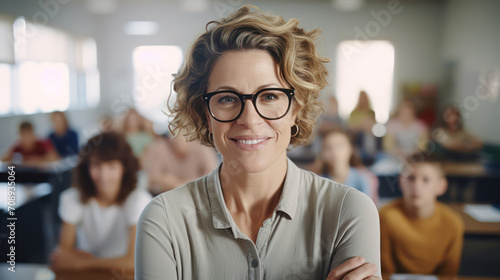 Inspirational educator, Smiling American teacher in class, students engaged in learning.