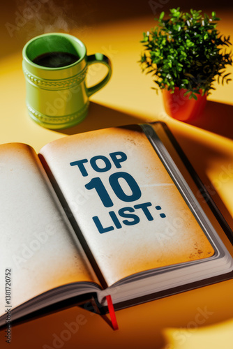 Inspirational Morning Routine with Open Notebook Featuring 'Top 10 List' and Fresh Coffee on Bright Yellow Background