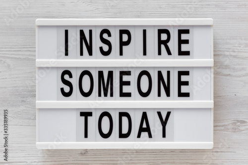 'Inspire someone today' words on a lightbox on a white wooden background, top view. Overhead, from above, flat lay. Close-up.