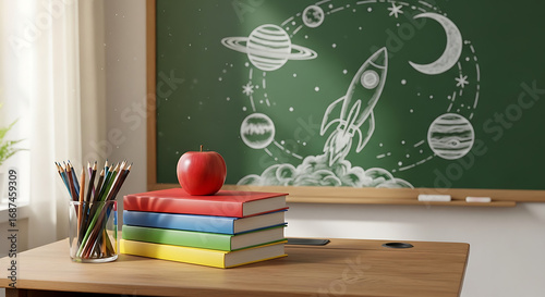 Inspire young minds with a vibrant classroom scene featuring books, pencils, and a rocket drawing on a chalkboard.