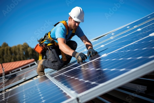 Installing solar photovoltaic panel system. Alternative energy ecological concept.