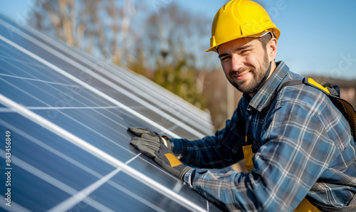 Installing solar photovoltaic panel system. Solar panel technician installing solar panels on roof. Alternative energy ecological concept. Green energy concept.Place for text.Copy space.