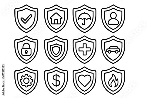 Insurance and protection line icon set. Shield symbols for security, safety, and guarantee. Vector icons for home, car, life, health, and financial risk coverage concepts.