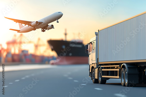 Integrated Logistics: A plane takes off near a port with a semi-truck, symbolizing efficient transport and global trade connections.