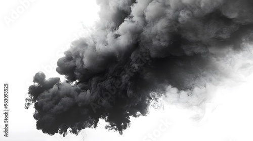Intense and dense black smoke, violent explosion, billowing dark clouds, turbulent plume, swirling patterns, volcanic eruption, thick smog, ominous atmosphere, dramatic contrast.