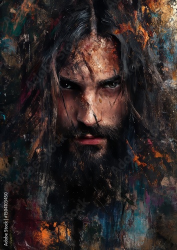 Intense and Emotionally Charged Portrait of a Man with Long Hair, Captured in Hyper-Realistic Style with Vivid Colors and Dramatic Texture