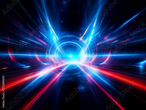 Intense blue light bursts from a metallic circular core, radiating outwards in a dynamic, futuristic display. Speed and energy are vividly conveyed through the bright streaks.