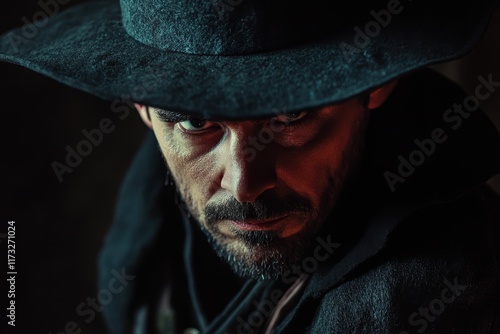 Intense character portrait of a mysterious figure in dark attire and wide-brimmed hat