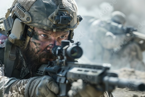 Intense close-up of a soldier aiming through the scope of his rifle in the midst of a battlefield scene. Military action, combat zone atmosphere. Realistic depiction for tactical media. Generative AI