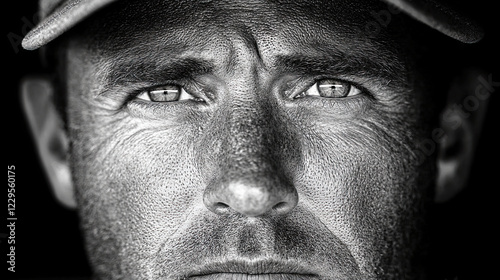 Intense Close-Up of a Weathered Man With Piercing Eyes, Showcasing Determination and Grit Against a Dramatic Dark Background