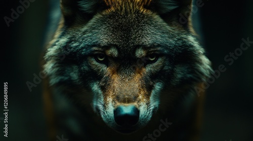 Intense close-up of a wolf's face in a dark forest.