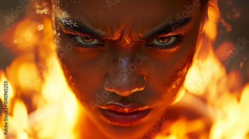 Intense Close-Up of a Woman's Face Surrounded by Fire