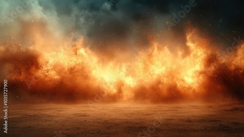 intense dust cloud billowing from the ground resembling a sandstorm in the desert capturing the dynamic movement of particles with a realistic effect of flying dirt and soil