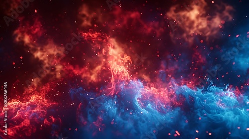 Intense firestorm background featuring red and blue flame elements, Vray-rendered. High-definition digital illustration with burning sparks.