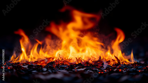 Intense flames consume scattered leaves on the ground with black background