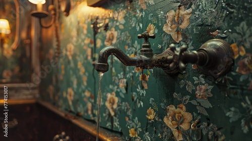 Intense focus on a problematic water leak from a tap, set against the unique wallpaper of a restaurant's interior, capturing urgency
