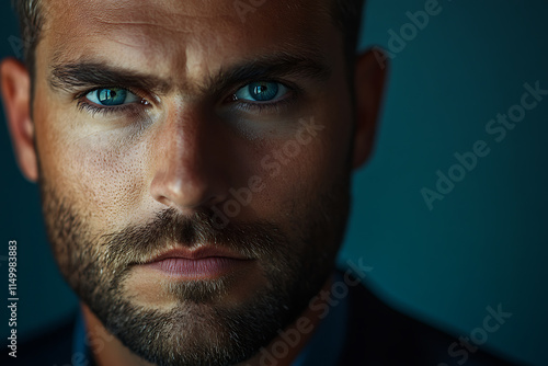 Intense Gaze: A Close-Up Portrait of a Man with Striking Blue Eyes and a Defined Jawline