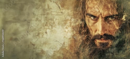 Intense gaze of rugged man with beard against textured background, showcasing raw emotion and strength, copy space for text