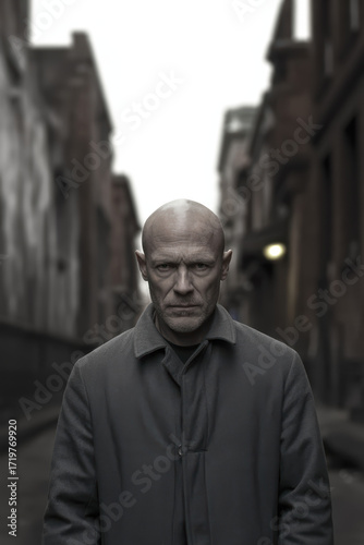 Intense Portrait of a Determined Man Staring Down a Gritty Urban Alley in Muted Tones