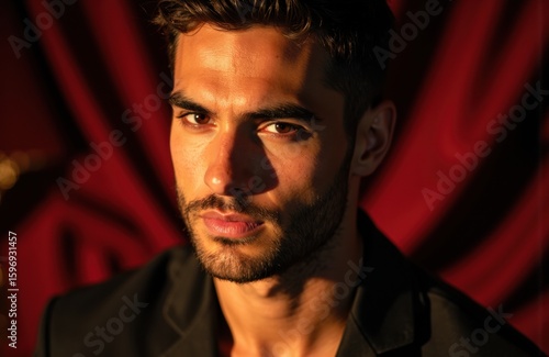 Intense portrait of a young man with a serious expression against a dramatic red background